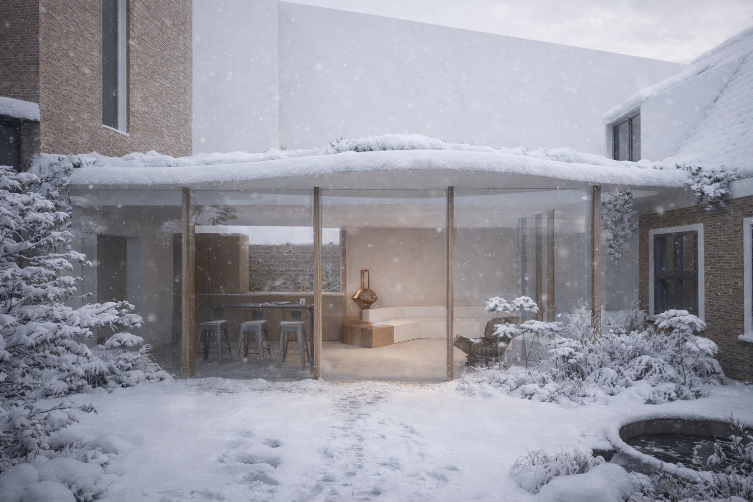 Door een open en verbindend volume toe te voegen, worden de gebouwen samengebracht tot één geheel. De tuin krijgt hiermee een centrale rol en verandert in een leeftuin die direct verbonden is met de keuken, pantry en zitplekken. Zo ontstaat een vanzelfsprekende relatie tussen wonen en buiten zijn, en wordt de tuin een actief en dagelijks onderdeel van het leven in huis.